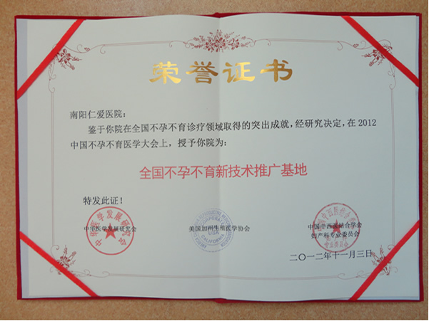 为了表彰在我国不孕不育事业中取得突出成就的单位,组委会进行了“全国十大不孕不育专科医院、领先优秀不孕不育医疗合作单位、全国不孕不育新技术推广基地、全国优秀不孕不育诊疗医师”的评选工作,南阳天伦医院作为豫西南地区医院被授予全国不孕不育新技术推广基地。